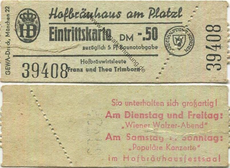 Hofbräuhaus am Platzl - Eintrittskarte - Wirtsleute Franz und Thea Trimborn (E72377y) |