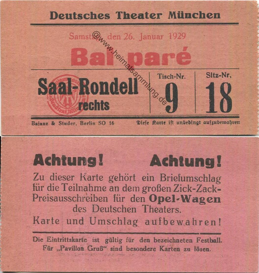 Deutsches Theater München - Samstag 26. Januar 1929 - Bal paré - Saal-Rondell rechts - Eintrittskarte (G62718y) |