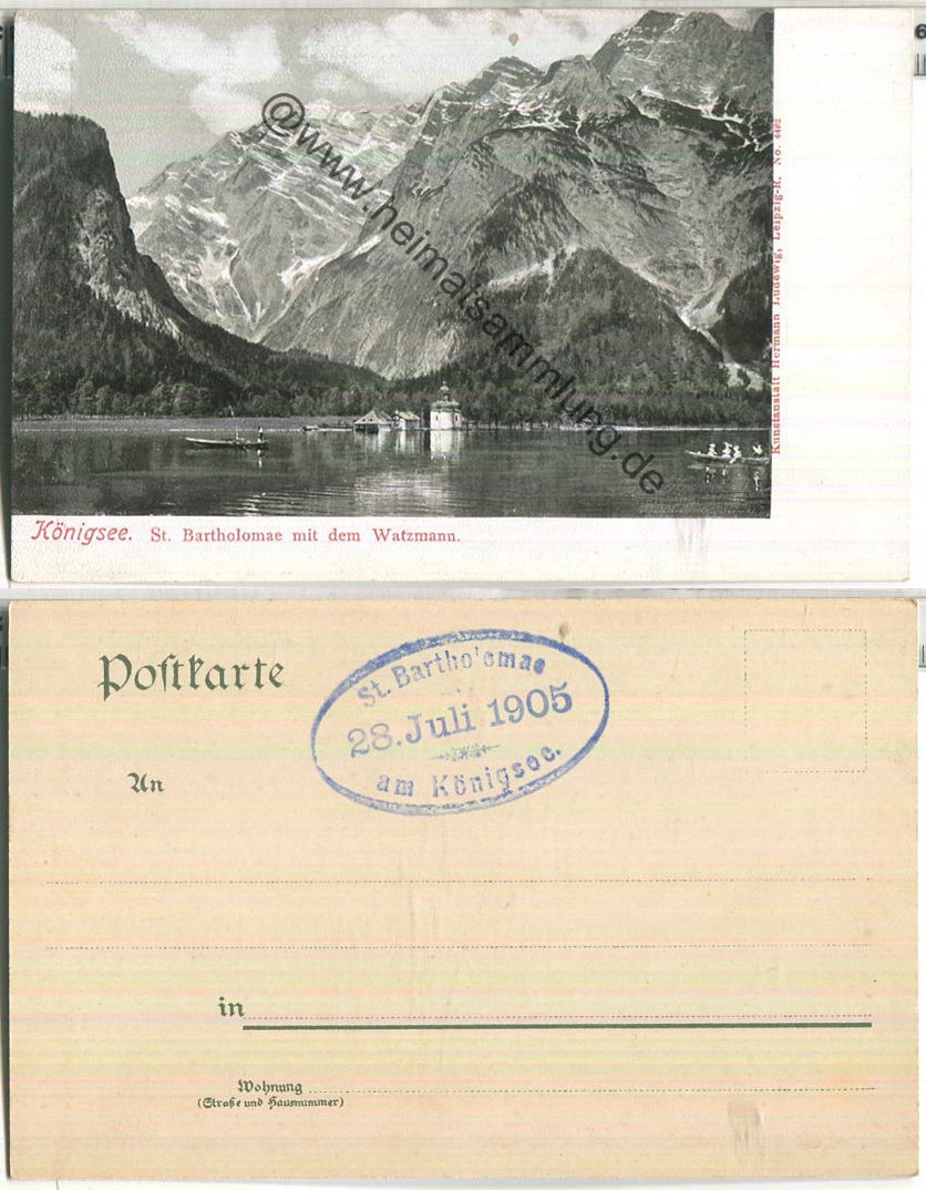 Königsee - St. Bartholomae mit dem Watzmann - Verlag Hermann Ludewig Leipzig 1905 (E86702y) |
