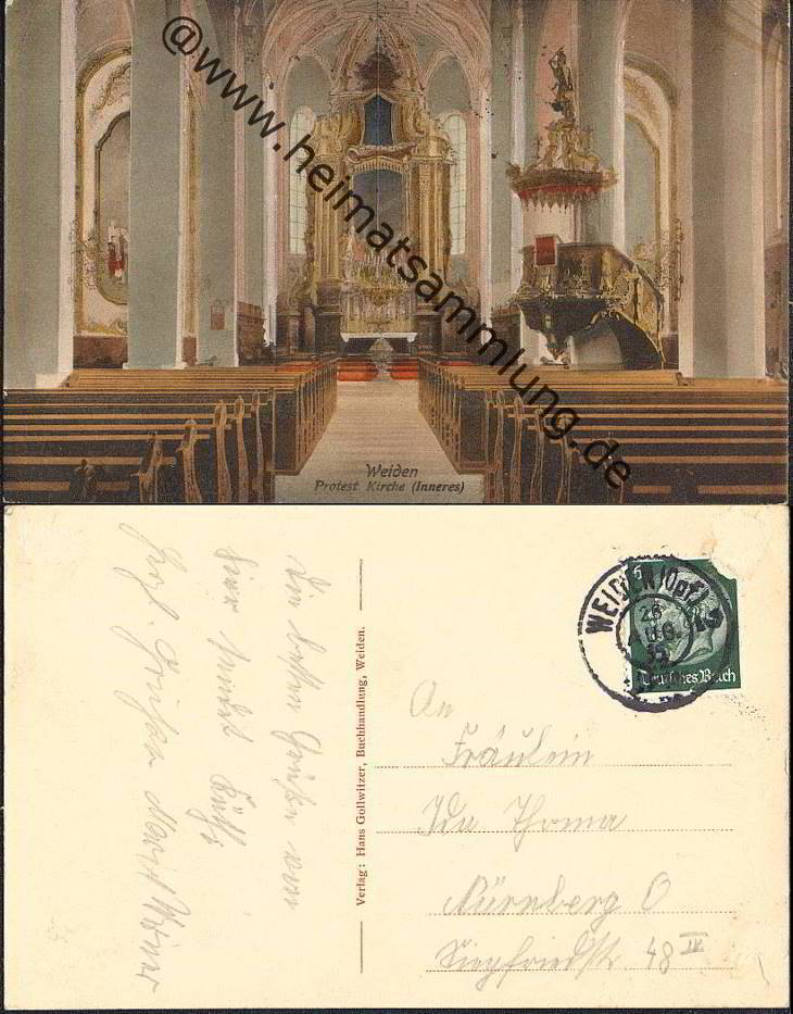 Weiden - Protestantische Kirche - Verlag Hans Gollwitzer Weiden - Gebrauchsspuren - rückseitig Klebestellen (G13386y)