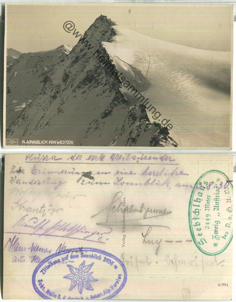 Sonnblick von Westen - Foto-Ansichtskarte - Rückseite beschrieben 1930 - Verlag Schildknecht Graz - Karte ist rundum minimal beschnitten (E85749y) |