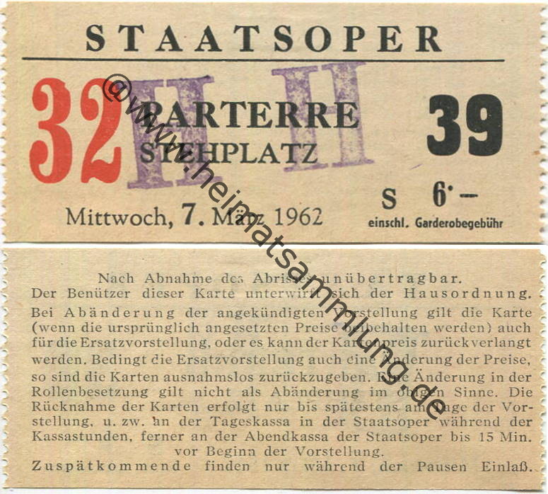 Wien - Staatsoper - Eintrittskarte Stehplatz 1962 (G51262y) |