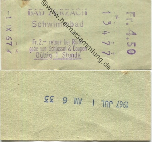 Bad Zurzach 1967 - Schwimmbad Fr. 2.- retour bei Rückgabe von Schlüssel & Coupon - Gültig 1 Stunde- Eintrittskarte Fr. 4.50 (G58370y) |