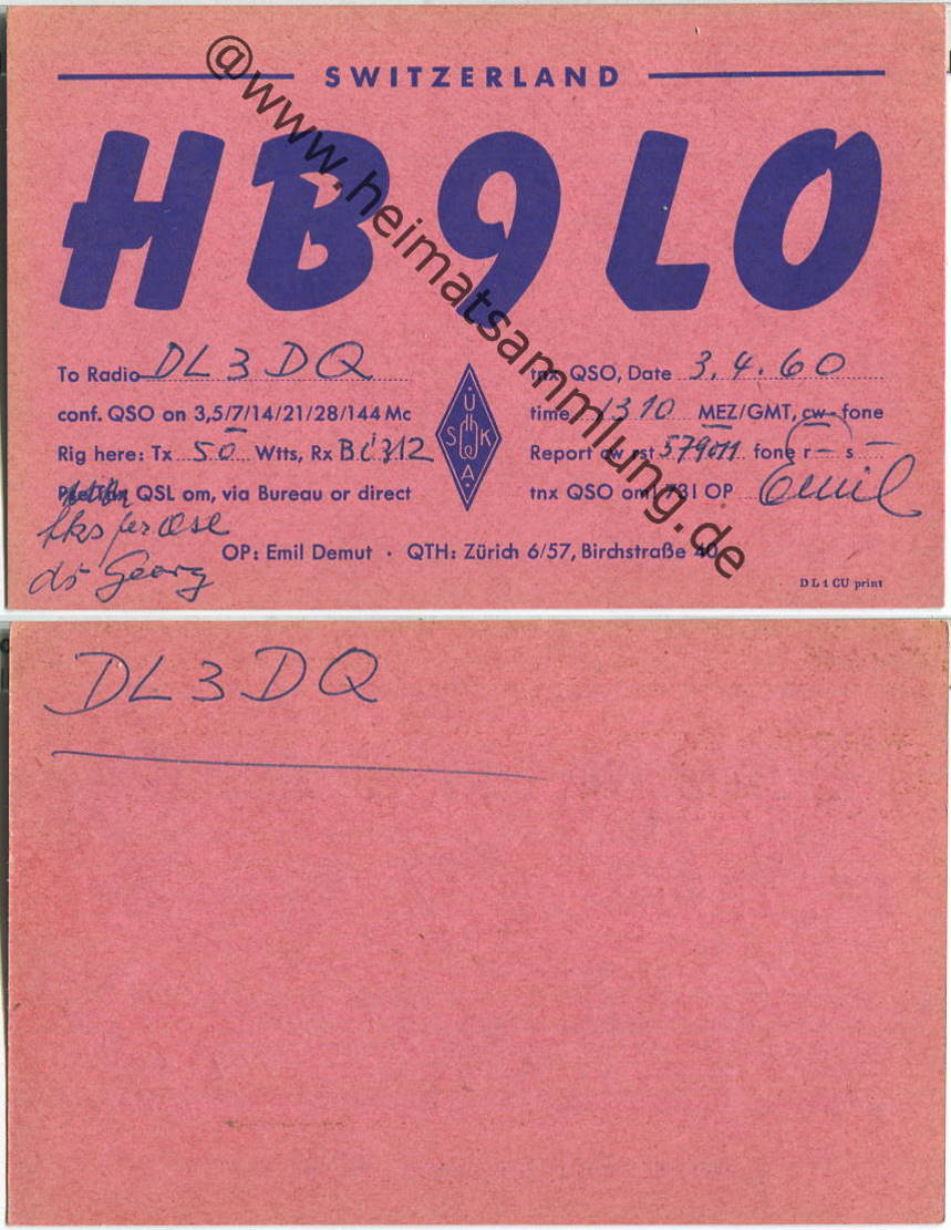 QSL - Funkkarte - HB9LO - Switzerland - Zürich - 1960 (G29830y) |