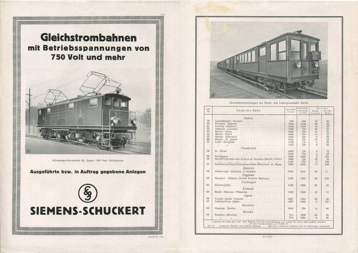 Gleichstrombahnen mit Betriebsspannungen von 750 Volt und mehr - Siemens-Schuckert 20er Jahre - DIN-A4 Doppelblatt mit 4 Abbildungen Gleichstromwagen der Hoch- und Untergrundbahn Berlin - Vierwagenzug der Rheinuferbahn - Gleichstromtriebwagen der Berliner Stadt- und Ringbahn - Schmalspurlokomotive für Japan - leichte Gebrauchsspuren (EP1368y) |